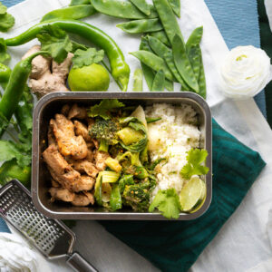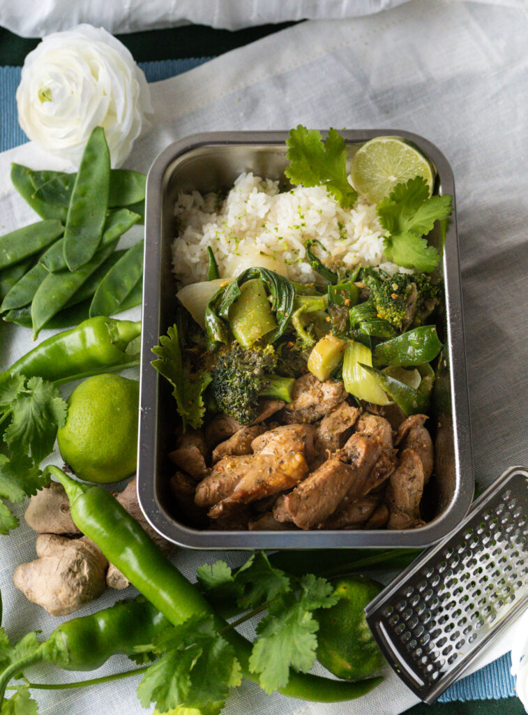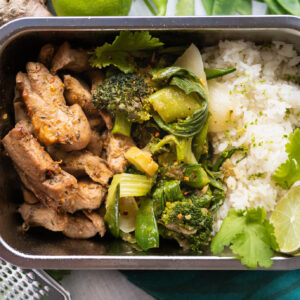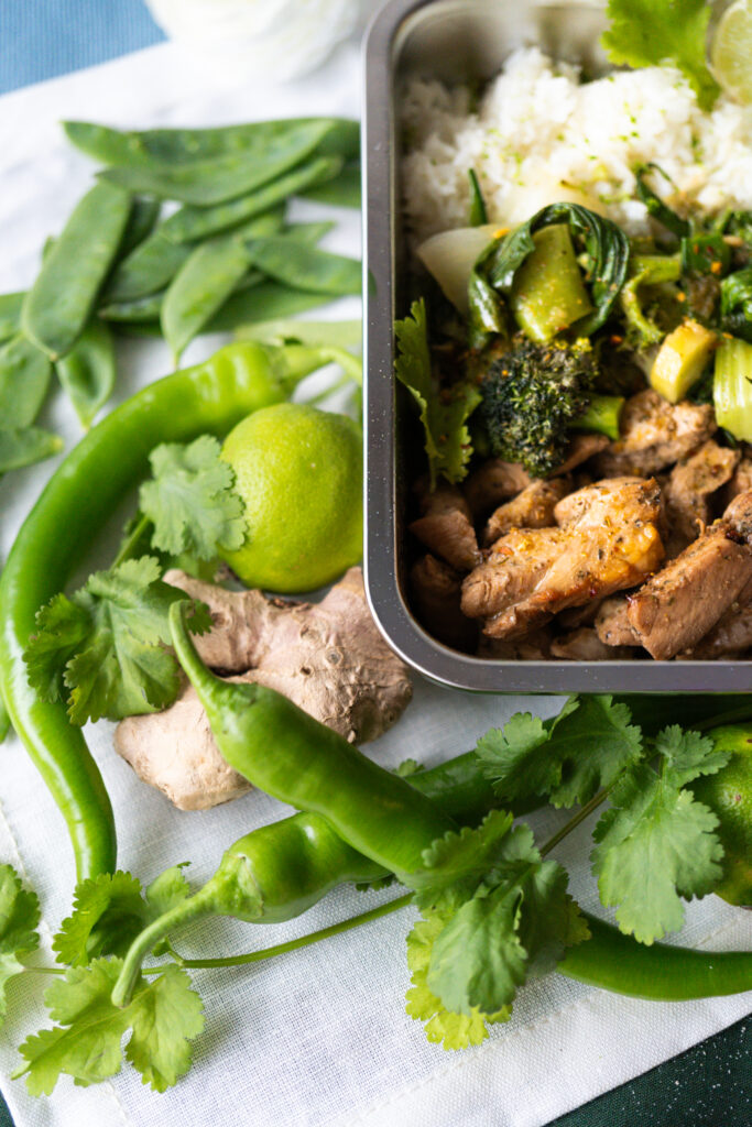 Ein ähnliches Rezept, dass sich auch für Mealprep ist mein Orangen-Pfeffer Huhn mit Kokos-Limettenreis und Chutney. Gerne auch mal hier vorbei schauen.