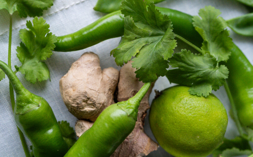 - Schalotte, Frühlingszwiebel, grüner Paprika, Ingwer und Knoblauch klein schneiden und mit etwas Öl bei kleiner Hitze langsam anbraten. Kleiner Tipp: einen Öl-Spray benutzen um hier schon etwas an Öl einzusparen.